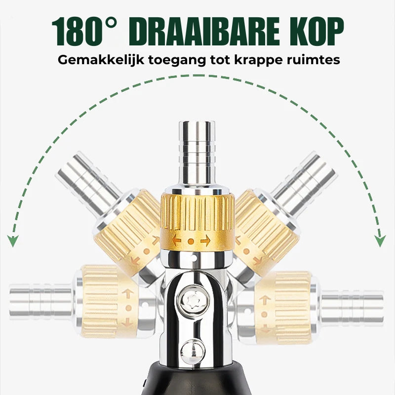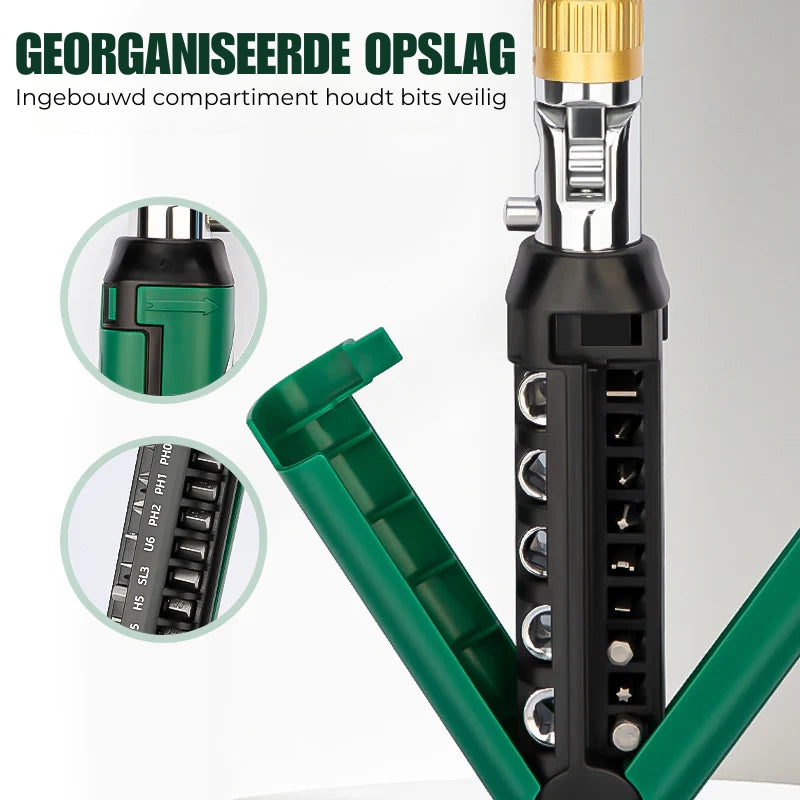 180° DRAAIBARE KOP VOOR BETERE BEREIKBAARHEID – De ratelschroevendraaier draait soepel tot 180 graden, zodat u comfortabel kunt werken in krappe, lastige ruimtes en hoeken zonder uw pols te belasten of aan precisie in te boeten.