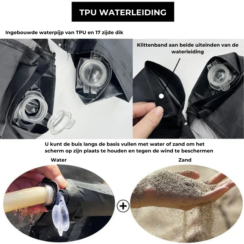 Stabiele bodem: Ingebouwde TPU en 17 zijden dikke waterleiding in de onderrand van het muskietennet van de paraplu, goede stevigheid en duurzaamheid. Vul gewoon de buizen langs de basis met water om het scherm op zijn plaats te houden, zodat u zich geen zorgen hoeft te maken dat het door de wind wordt weggeblazen.
