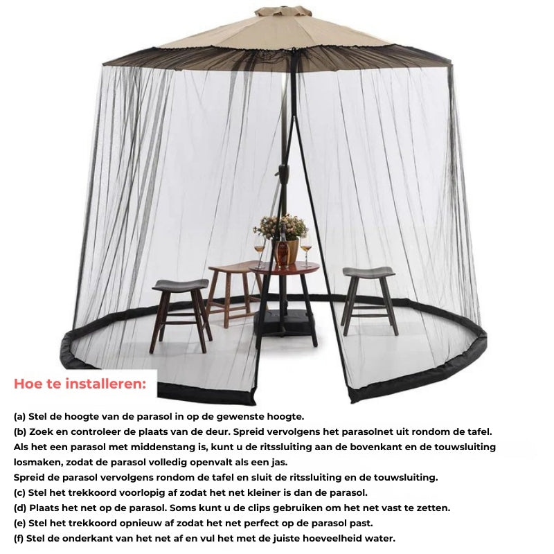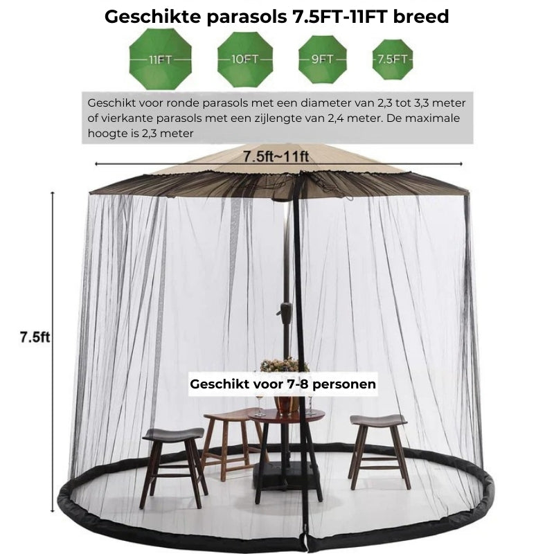 Vergroot het bereik van het parasolscherm: met een trekkoord aan de bovenkant kunt u het parasol-muggennet eenvoudig aanpassen aan een ronde parasol met een diameter van 2,3 tot 3 meter of een vierkante parasol met een zijlengte van 2,4 meter. De maximale hoogte is 2,3 meter. Geschikt voor 7 tot 9 personen. (Let op: de parasol en stoelen op de foto's zijn niet inbegrepen in het pakket.)