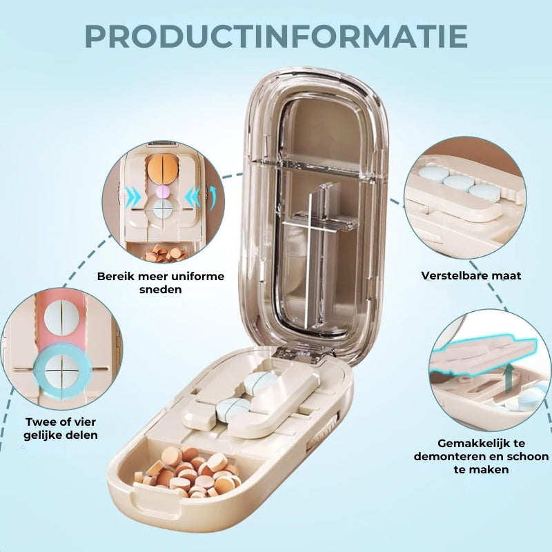 Multifunctionele pillensnijder - Onze pillensnijder kan meerdere tabletten tegelijk halveren of in vieren snijden, wat tijd en moeite bespaart. Het onderste vakje biedt extra ruimte voor medicijnen en is ideaal om mee te nemen in uw handtas of rugzak.