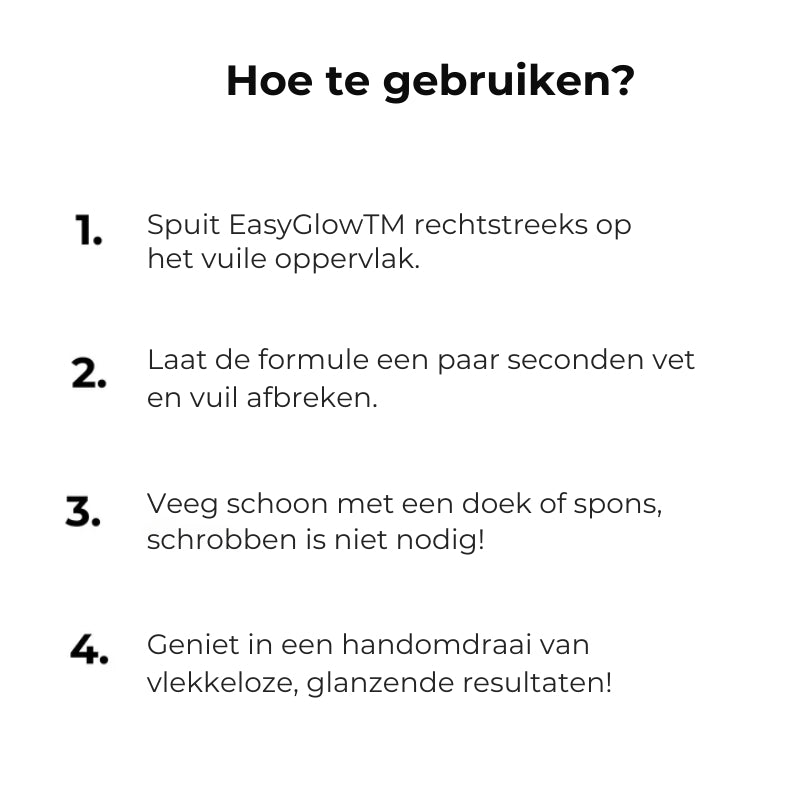 EasyGlow™ maakt schoonmaken een fluitje van een cent en verandert vettige, vuile oppervlakken in vlekkeloze, glanzende ruimtes met minimale inspanning. Of het nu gaat om uw keuken, auto of alledaagse voorwerpen, onze niet-giftige formule kan het allemaal aan.