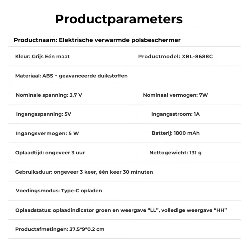 - Lichtgewicht, ademend en antislipontwerp: Het verwarmingskussen voor de pols is gemaakt van geavanceerde duikstoffen. De polssteun is lichtgewicht, winddicht en ademend. De antislip binnenlaag zorgt voor een goede pasvorm, terwijl de sterke plakgesp het geschikt maakt voor zowel de linker- als de rechterhand.