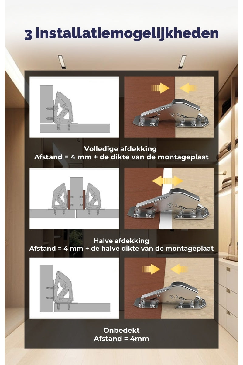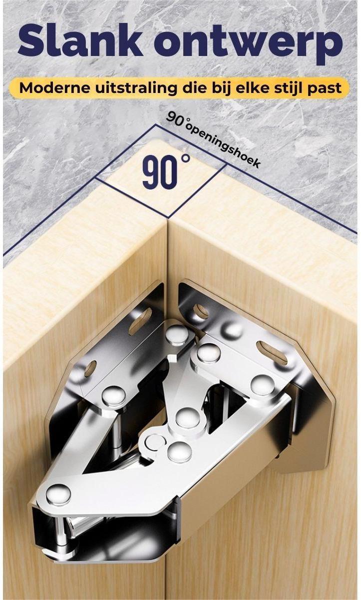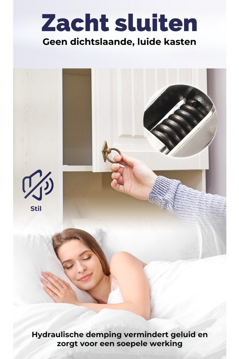 Is het scharnier van je kast kapot? Geen zorgen – met deze innovatieve scharnieren herstel je je kastdeur snel en eenvoudig. Dankzij het slimme ontwerp met hydraulische dempers sluit de deur altijd zacht en geruisloos, zonder harde klappen.