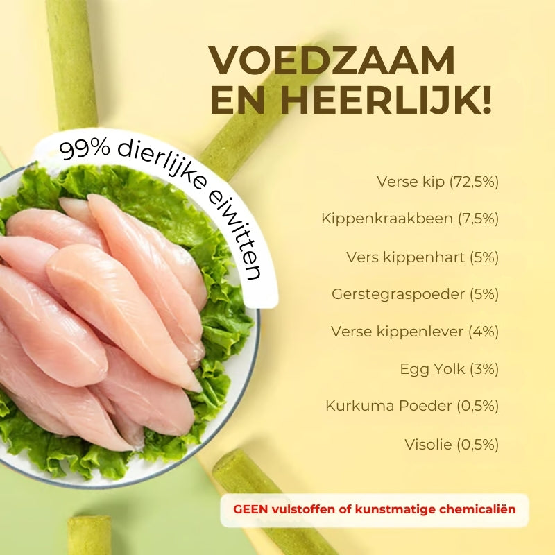 Vol proteïne en kattengras: We hebben geen compromissen gesloten met de ingrediënten, want we beloven dat elke stick vol zit met voornamelijk kip en tonnen kattengras zonder vulmiddelen of kunstmatige chemicaliën!