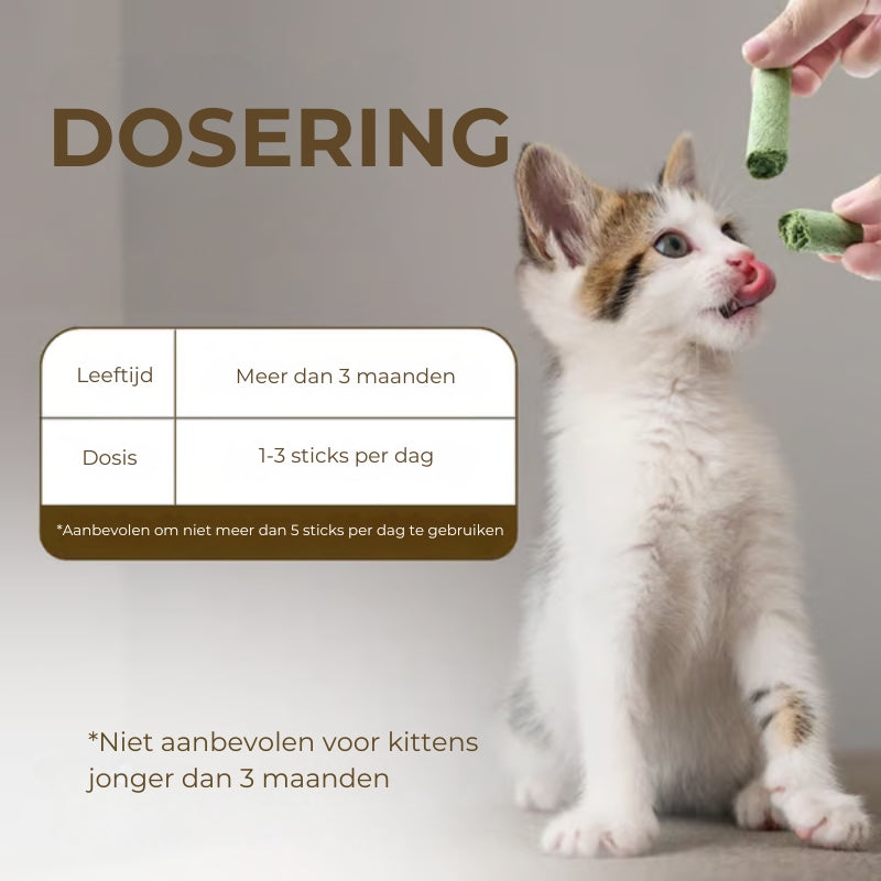 Elke stick is zorgvuldig gevormd uit organisch kattengras, een favoriet onder onze katachtige metgezellen, bekend om zijn goede spijsvertering en zijn aantrekkingskracht op hun aangeboren kauwinstinct.