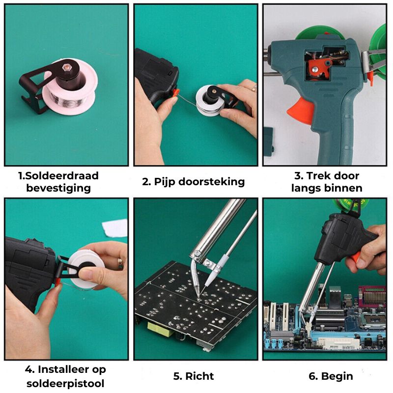 Automatisch soldeerapparaat, solderen wordt een fluitje van een cent. Druk gewoon op de trekker en de soldeerdraad volgt de roestvrijstalen draad tot aan de plaats waar u wilt solderen.